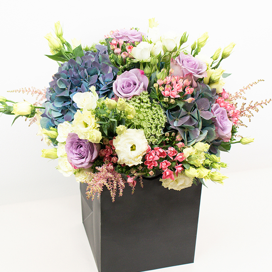 This wonderful arrangement is bursting with blue hydrangeas, light purple roses, green lisianthus, white spray roses, Ammi visnaga, pink bouvardia and pink astilbe to create a magical combination that will make a great impression! A very stylish gift that you can send to your family and friends!